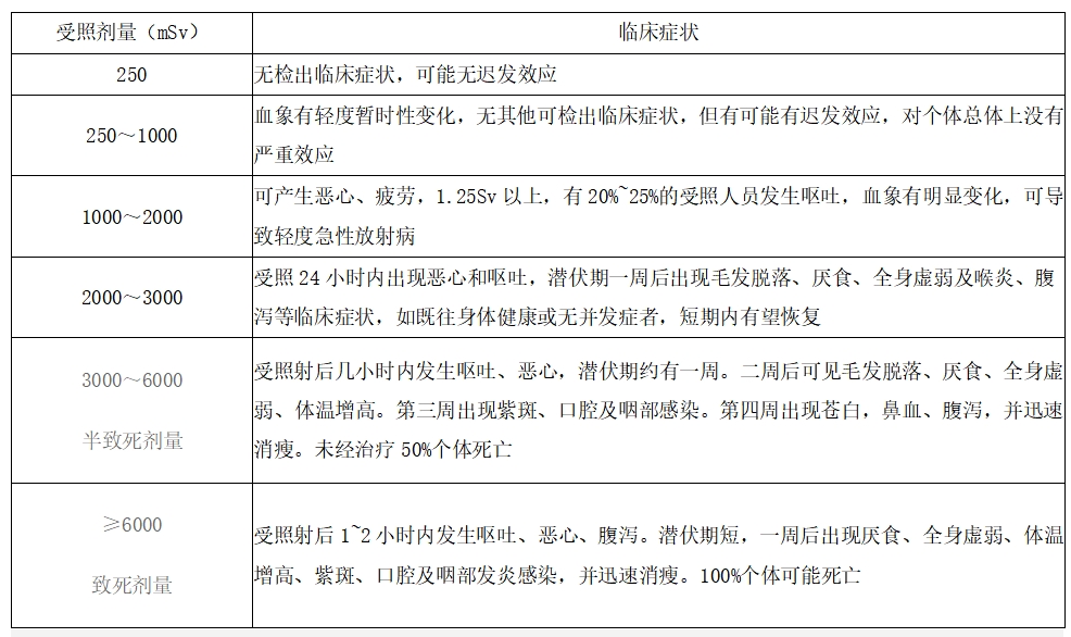 辐射可能对身体细胞和组织造成损害。辐射的影响视乎辐射的强度、接触时间的长短及受影响身体细胞的种类而定。全身一次受到X、γ射线均匀照射的症状见下表。