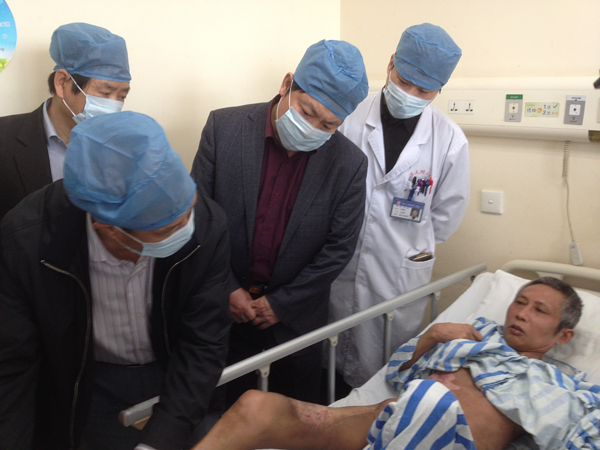 专家组首先前往病房看望受照人员,询问病人恢复情况、查看病历、体格检查及沟通的结果,人员身体及精神状况良好,术后腿部机能逐步恢复,但目前还不能下床行走。随后与江苏省卫生计生委应急办、疾控中心,苏州市卫生局及医院人员召开讨论会,就病人接受治疗及恢复情况作了全面了解。