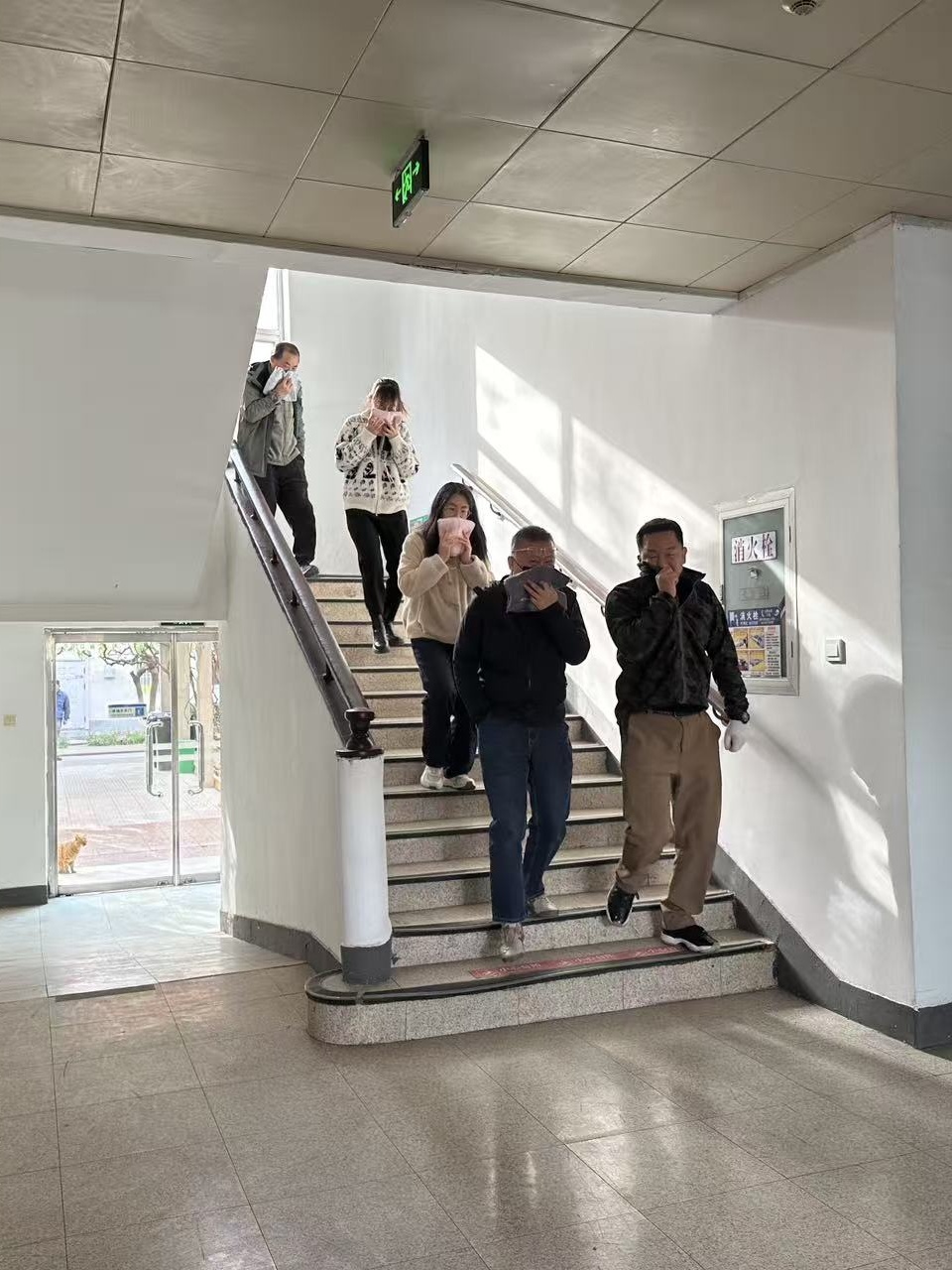 讲座结束后进行疏散演习,警报声响,全体员工迅速进入应急状态,按照疏散路线,用湿毛巾或袖口捂住口鼻,弯腰低姿,快速而有序地从各个办公区域撤离到指定的安全集合点,整个疏散过程紧张而不慌乱。